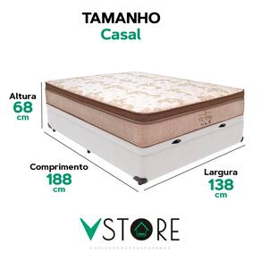 A tecnologia que a sua casa merece está na V-Store! O colchão Victory Solteiro da V-Store oferece noites de sono tranquilas e confortáveis, com seu toque macio e sistema de molas ensacadas que garantem suporte ideal e independência de movimentos. O Pillow Euro Pillow proporciona ainda mais suavidade, enquanto a tecnologia EPS adiciona resistência e durabilidade. Com proteções contra ácaros, fungos, mofo e alergias, ele garante um ambiente de sono saudável. Suporta até 150 kg por pessoa e tem garantia de 12 meses.A Base Box Baú Bravus da V-Store combina praticidade e sofisticação, com madeira reflorestada e revestimento sintético que facilitam a manutenção. Seu design otimiza o espaço de armazenamento e oferece resistência, suportando até 150 kg por pessoa. Com 44 cm de altura total e Selo Ecologicamente Correto, ela é ideal para quem busca sustentabilidade e qualidade. Transforme seu quarto com o colchão Victory e a Base Box Baú Bravus da V-Store!Característica Do Colchão: Modelo: VictoryMarca: V-StoreTamanho: CasalDimensões: 138x30x188 (Largura x Altura x Comprimento)Conforto: MédioSistema: Molas EnsacadasPillow: Euro PillowPeso Máximo recomendado: 150 kg (Por pessoa)Proteções: Antiácaro, antialérgico, antifungo, antimofoGarantia: 12 Meses (Espuma) / 10 anos ( Conjunto de Molas Ensacadas)Característica Da Base: Marca: V-StoreModelo: BravusTamanho: CasalDimensões: 138x44x188 (Largura x Altura x Comprimento)Estrutura: MadeiraPeso máximo recomendado: 150 kg (Por Pessoa)Altura do Box: 38 cmAltura dos Pés: 6 cmAltura total: 44 cmGarantia: 12 Meses (Estrutura) / 3 meses (Tecido)Selo Ecologicamente CorretoAtenção:- Antes de finalizar sua compra, recomendamos que verifique se as dimensões do produto são adequadas para serem transportadas pelos elevadores, portas, escadas e corredores de sua residência. Ressaltamos que não nos responsabilizamos pelo transporte do produto por meios específicos, como escadas, guinchos ou içamentos.- É possível que hajam leves variações de cor de acordo com o dispositivo que está sendo utilizado como smartphones, computadores, monitores e outros.