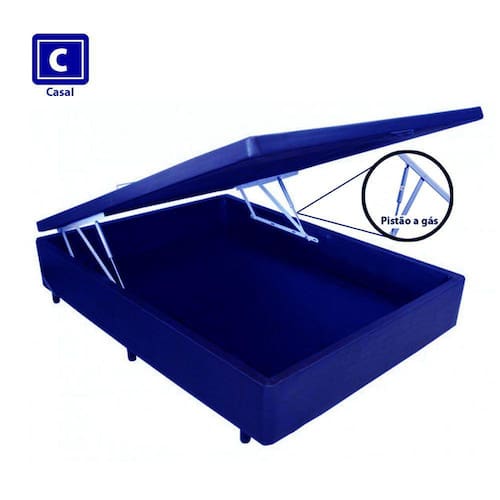 - Cama Box Baú Casal azul com Pistão a gás - 138x188x35 tem uma base com estrutura produzida em madeira de reflorestamento tratada.