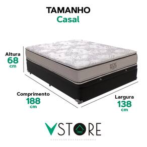 A tecnologia que a sua casa merece está na V-Store! O Conjunto Colchão Four Seasons e Base Box Baú Bravus é a solução ideal para quem busca conforto, durabilidade e praticidade. O colchão, com molas ensacadas, pillow top e tecnologia EPS, oferece suporte independente e conforto térmico, enquanto o revestimento em malha 100% algodão e tratamentos antiácaro e antialérgico garantem mais saúde e bem-estar. A Base Box Baú Bravus, feita com madeira reflorestada e revestida com tecido sintético, combina resistência, elegância e funcionalidade, oferecendo um excelente espaço de armazenamento e otimizando o seu quarto.Característica Do Colchão: Modelo: Four SeasonMarca: V-StoreTamanho: CasalDimensões: 138x30x188 (Largura x Altura x Comprimento)Conforto: MédioSistema: Molas EnsacadasPillow: Pillow TopPeso Máximo recomendado: 150 kg (Por pessoa)Proteções: Antiácaro, antialérgico, antifungo, antimofoGarantia: 12 Meses (Espuma) / 10 anos ( Conjunto de Molas Ensacadas)Característica Da Base: Marca: V-StoreModelo: BravusCor do Box: PretoTamanho: CasalDimensões: 138x44x188 (Largura x Altura x Comprimento)Estrutura: MadeiraPeso máximo recomendado: 150 kg (Por Pessoa)Altura do Box: 38 cmAltura dos Pés: 6 cmAltura total: 44 cmGarantia: 12 Meses (Estrutura) / 3 meses (Tecido)Selo Ecologicamente CorretoAtenção:- Antes de finalizar sua compra, recomendamos que verifique se as dimensões do produto são adequadas para serem transportadas pelos elevadores, portas, escadas e corredores de sua residência. Ressaltamos que não nos responsabilizamos pelo transporte do produto por meios específicos, como escadas, guinchos ou içamentos.- É possível que hajam leves variações de cor de acordo com o dispositivo que está sendo utilizado como smartphones, computadores, monitores e outros.