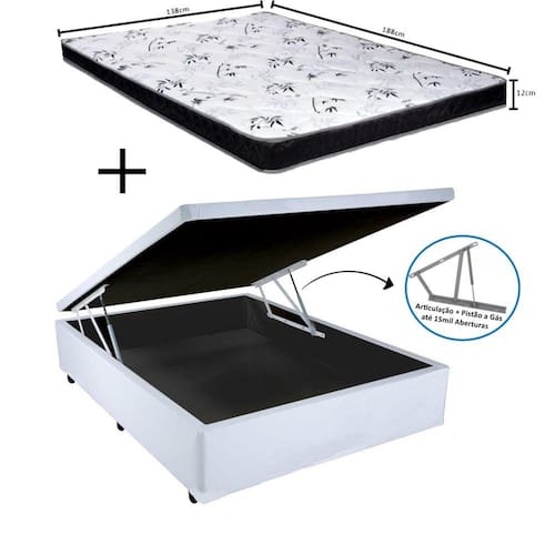 Cama Box Baú é produzida com os melhores materiais, proporcionando uma alta resistência e durabilidade prolongada. Proporcionando praticidade e conforto, tornando-se uma peça que pode ser combinada com a decoração de seu quarto deixando-o moderno e sofisticado. **As cores do produto podem variar de acordo com o monitor, a iluminação do ambiente e a sua percepção visual.** **Confira as dimensões do produto e certifique-se de que passará normalmente por supostos elevadores, portas, escadas e/ou corredores de sua residência** Características do Box: - Estrutura Interna: Estrutura em madeira 100% de Reflorestamento - Estrutura Externa: Branco - Tratamento Antiácaro: Sim - Tratamento Antialérgico: Sim - Saida de Ventilação: Sim - Ortopédico: Não - Tecido Antiderrapante: Não - Suporta até (kg): 135 Kg - Necessita Montagem: Não - Ambiente: Quarto - Altura: 35 cm - Largura: 138 cm - Profundidade: 188 cm - Possui Pés: Sim, feitos de madeira e fixos ao box - Altura dos Pés: 6 cm - Altura Interna: 27 cm - Baú: Pistão a Gás - Contém 02 puxadores, para maior facilidade na abertura - Contém 01 arco na parte de trás para o colchão não escorregar - Garantia do Fornecedor Cama: 03 meses Pistão: 06 meses Verifique nossas politicas internas para que não haja nenhuma dúvida no processo de entrega ao finalizar a compra, pois não fazemos a montagem e desmontagem do produto e/ou portas e janelas, transporte pela escada ou içamento pelo lado de fora do prédio. O Colchão com Espuma D23 é altamente resistente e confortável, proporcionando melhor sustentação e durabilidade ao produto, o tampo é bordado, que entrega uma camada extra de conforto. Para quem procura um colchão com custo e benefício, esse é ideal para toda família.
