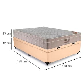Características do Box: - Estrutura Interna: Estrutura em madeira 100% de Reflorestamento; - Estrutura Externa: Sintético; - Tratamento Antiácaro: Sim; - Tratamento Antialérgico: Sim; - Saída de Ventilação: Não; - Ortopédico: Não; - Tecido Antiderrapante: Não; - Suporta até (kg): 150 Kg; - Necessita Montagem: Não. - Altura (sem os Pés): 36cm; - Largura: 138cm; - Comprimento: 188cm; - Altura dos Pés: 6cm.