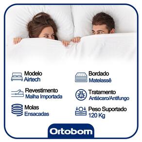 O Colchão De Molas Ensacadas AirTech Ortobom é indicado para pessoas de até 150kg proporcionando conforto firme, o que lhe confere firmeza suficiente para preservar sua coluna durante o sono sem comprometer seu conforto. Fabricado com matérias-primas de alta qualidade e durabilidade, o AirTech Molas Ensacadas Ortobom garante conforto e segurança por muito mais tempo. **As cores do produto podem variar de acordo com o monitor, a iluminação do ambiente e a sua percepção visual.** **Confira as dimensões do produto e certifique-se de que passará normalmente por supostos elevadores, portas, escadas e/ou corredores de sua residência** Benefícios Externos do Colchão - Tipo de Pillow: Pillow Top Europeu - Tipo de Bordado do Tecido de Revestimento: Bordado Matelassê - Tipo Tecido de Forração Revestimento: Malha Importada - Tipo de Tecido de Revestimento da Faixa Lateral: Em Nobuck - Tecido com Tratamento: AntiÁcaro e AntiFungo - Modo de Utilização: One Side No Turn - Tipo de Forração do Revestimento Inferior: Antiderrapante Características Interna do Colchão - Tipo de Estrutura de Molas: Molas Ensacadas - Camadas Interna do Estofamento de Espuma: Espuma de Qualidade - Outras Características Internas: Polyframe Reforço nas bordas/ Placa de Eps Características Gerais do Colchão - Suporte de Peso: até 120 Kg - Tipo de Conforto: Firme - Largura: 138cm - Comprimento: 188cm - Altura: 25cm Benefícios Gerais do Colchão Certificados de Qualidade - Certificação de Qualidade Aprovada - Selo Ecologicamente Correto - Certificado inmetro Vantagens Extras do o colchões de molas ensacadas - Ecológicamente Correto Nossa Avaliação - Classificação de Qualidade Muito Boa Características do Baú: - Estrutura Interna: Estrutura em madeira 100% de Reflorestamento; - Estrutura Externa: Sintético; - Tratamento Antiácaro: Sim; - Tratamento Antialérgico: Sim; - Saida de Ventilação: Não; - Ortopedico: Não; - Tecido Antiderrapante: Não; - Suporta até (kg): 150 Kg; - Necessita Montagem: Não. - Altura: 28cm; - Largura: 138cm; - Comprimento: 188cm; - Altura dos Pés: 12cm; Verifique nossas politicas internas para que não haja nenhuma dúvida no processo de entrega ao finalizar a compra, pois não fazemos a montagem e desmontagem do produto e/ou portas e janelas, transporte pela escada ou içamento pelo lado de fora do prédio.