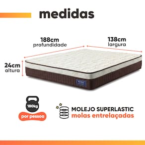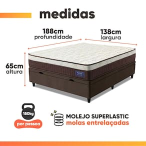 REVESTIMENTO INTERNO: Estrutura com molas Superlastic de alta resistência, projetadas para oferecer suporte firme e progressivo. Suportam até 180 kg por pessoa, garantindo excelente estabilidade, durabilidade e conforto durante o sono.