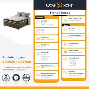 Fabricado com matéria-prima de qualidade, ele suporta até 120kg por pessoa, proporcionando conforto médio, o que lhe confere conforto extra durante o sono sem comprometer sua coluna. Base baú é confeccionada com madeira de reflorestamento com tratamentos anticupim e antimofo, o seu diferencial é seu compartimento interno garantindo um novo espaço em seu quarto, agregando um valor e sofisticação ao ambiente.