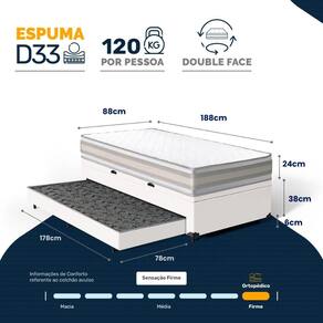 - Dimensões do produto (larg. x comp. x alt.) Solteiro: 88x188x44cm.
