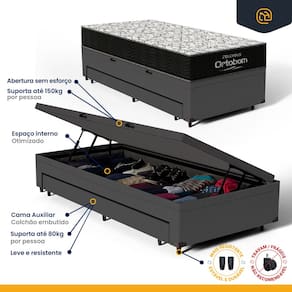 A Base Baú com Auxiliar da Lucas Colchões combina praticidade e durabilidade. A cama auxiliar embutida é uma solução inteligente para otimizar espaço, ideal para visitas ou famílias grandes. Fácil de manusear, pode ser utilizada sempre que necessário e guardada discretamente, mantendo o ambiente organizado. O baú com um super espaço interno, ideal para guardar roupas de cama, edredons, travesseiros, mantas, toalhas e etc. É perfeita para quem busca otimizar espaço sem abrir mão da qualidade e resistência.