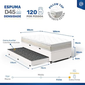 Cama Box Baú com Colchão de Espuma D45 Pillow Top Ortopédico Domo + Auxiliar Solteiro 88cm - Branco
