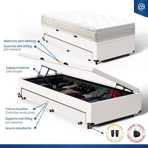 A Base Baú com Auxiliar da Lucas Colchões combina praticidade e durabilidade. A cama auxiliar embutida é uma solução inteligente para otimizar espaço, ideal para visitas ou famílias grandes. Fácil de manusear, pode ser utilizada sempre que necessário e guardada discretamente, mantendo o ambiente organizado. O baú com um super espaço interno, ideal para guardar roupas de cama, edredons, travesseiros, mantas, toalhas e etc. É perfeita para quem busca otimizar espaço sem abrir mão da qualidade e resistência.