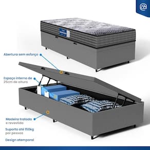 Além do colchão, a base baú incorporada aumenta a funcionalidade do seu quarto, oferecendo um espaço de armazenamento adicional. Construída com madeira tratada, tornando-a não apenas prática mas também durável e resistente. Este conjunto é a solução perfeita para quem busca maximizar o conforto e a utilidade em espaços compactos.
