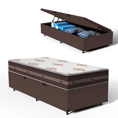 Além do colchão, a base baú incorporada aumenta a funcionalidade do seu quarto, oferecendo um espaço de armazenamento adicional. Construída com madeira tratada, tornando-a não apenas prática mas também durável e resistente. Este conjunto é a solução perfeita para quem busca maximizar o conforto e a utilidade em espaços compactos.