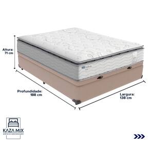 O conforto que sua casa precisa e a qualidade que você merece está na Kazamix! Colchão Probel Amsterdã – a escolha perfeita para noites de sono inigualáveis. Equipado com Molas Ensacadas Prolastic, oferece suporte individualizado, reduzindo a transferência de movimentos para um descanso mais tranquilo. Seu Pillow Top Super proporciona uma camada extra de maciez, elevando o conforto e garantindo uma experiência de luxo. Com camadas de espuma D33 e D65, o Amsterdã combina firmeza e durabilidade, enquanto as proteções antiácaro, antialérgico e antifungo criam um ambiente de sono saudável. Invista em qualidade e bem-estar com o Colchão Probel Amsterdã e transforme suas noites. Modelo: Amsterdã Marca: Probel Tamanho: Casal Dimensões: 138x188X34 (Largura x Comprimento x Altura) Conforto: Firme Sistema: Molas Ensacadas Pillow: Pillow Top Peso Máximo recomendado: 120 kg (Por pessoa) Proteções: Antiácaro, antialérgico, antifungo, antimofo Garantia: 1 ano pelo FabricanteO conforto que sua casa precisa e a qualidade que você merece está na Kazamix Aproveite cada metro quadrado do seu dormitório com a Cama Box Baú! Projetada com madeira de reflorestamento reforçada, a Cama Box Baú é a escolha ideal para quem busca otimização de espaço e praticidade na organização do dia a dia. Com um baú generoso, ela oferece a solução perfeita para armazenar travesseiros extras, cobertores, malas e muito mais. Além disso, sua estrutura robusta suporta até 150 kg por pessoa, garantindo a sustentação ideal para o seu colchão e prolongando sua vida útil. O pistão a gás robusto proporciona uma abertura suave e segura do baú, oferecendo praticidade e resistência no uso diário. Para completar, o acabamento de alta qualidade combina perfeitamente com qualquer estilo de decoração, agregando elegância e versatilidade ao seu ambiente. Não perca tempo! Adquira agora mesmo sua Cama Box Baú e diga adeus à falta de espaço e desorganização. Marca: KazaMix Modelo: Baú Tamanho: Casal Dimensões: 138X188X37 (Largura x Comprimento x Altura) Estrutura: Madeira Peso máximo recomendado: 150 kg (Por Pessoa) Altura do Box: 32 cm Altura dos Pés: 5 cm Altura total: 37 cm Garantia: 03 meses Selo Ecologicamente Correto Atenção: Antes de finalizar sua compra, certifique-se de que as dimensões do produto sejam adequadas para serem transportadas pelos elevadores, portas, escadas e corredores de sua residência. Ressaltamos que não nos responsabilizamos pelo transporte do produto por meios específicos, como escadas, guinchos ou içamentos.