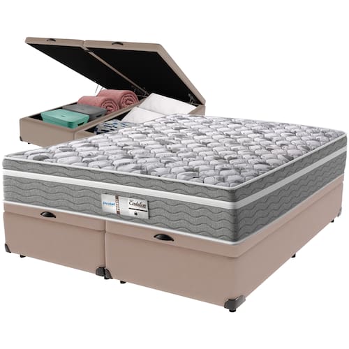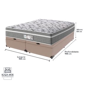 O conforto que sua casa precisa e a qualidade que você merece está na Kazamix! O Colchão Evolution é a escolha ideal para quem busca conforto, suporte e qualidade em cada noite de sono. Com Molas Ensacadas que oferecem um suporte individualizado, e um Pillow Euro que proporciona uma camada extra de suavidade, esse colchão transforma seu descanso em uma experiência de luxo. Com espuma D28 de alta densidade, o Evolution garante firmeza e conforto duradouros. Seu acabamento em poliéster diamante e bordado em matelassê trazem um toque de elegância e sofisticação ao seu ambiente. Além disso, o colchão é tratado com propriedades antiácaro e antialérgico, garantindo um sono mais saudável e seguro. Invista no seu bem-estar com o colchão Evolution, e experimente a combinação perfeita de conforto e durabilidade! Modelo: Evolution Marca: Probel Tamanho: Queen Dimensões: 158x198X32 (Largura x Comprimento x Altura) Conforto: Intermediário Sistema: Molas Ensacadas Pillow: Euro Pillow Peso Máximo recomendado: 110 kg (Por pessoa) Proteções: Antiácaro, antialérgico, antifungo, antimofo Garantia: 1 ano pelo FabricanteO conforto que sua casa precisa e a qualidade que você merece está na Kazamix Aproveite cada metro quadrado do seu dormitório com a Cama Box Baú! Projetada com madeira de reflorestamento reforçada, a Cama Box Baú é a escolha ideal para quem busca otimização de espaço e praticidade na organização do dia a dia. Com um baú generoso, ela oferece a solução perfeita para armazenar travesseiros extras, cobertores, malas e muito mais. Além disso, sua estrutura robusta suporta até 150 kg por pessoa, garantindo a sustentação ideal para o seu colchão e prolongando sua vida útil. O pistão a gás robusto proporciona uma abertura suave e segura do baú, oferecendo praticidade e resistência no uso diário. Para completar, o acabamento de alta qualidade combina perfeitamente com qualquer estilo de decoração, agregando elegância e versatilidade ao seu ambiente. Não perca tempo! Adquira agora mesmo sua Cama Box Baú e diga adeus à falta de espaço e desorganização. Marca: KazaMix Modelo: Baú Tamanho: Queen Dimensões: 158X198X37 (Largura x Comprimento x Altura) Estrutura: Madeira Peso máximo recomendado: 150 kg (Por Pessoa) Altura do Box: 32 cm Altura dos Pés: 5 cm Altura total: 37 cm Garantia: 03 meses Selo Ecologicamente Correto Atenção: Antes de finalizar sua compra, certifique-se de que as dimensões do produto sejam adequadas para serem transportadas pelos elevadores, portas, escadas e corredores de sua residência. Ressaltamos que não nos responsabilizamos pelo transporte do produto por meios específicos, como escadas, guinchos ou içamentos.