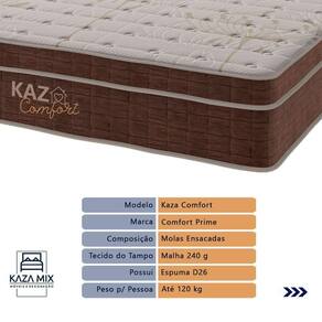 A experiência tátil é primordial, e o Colchão KazaComfort é meticulosamente desenvolvido para proporcionar um toque macio que convida ao relaxamento total. Você sentirá a diferença assim que se deitar. Com um peso máximo recomendado de até 120Kg por pessoa, este colchão é a escolha ideal para casais e indivíduos que valorizam qualidade e durabilidade.