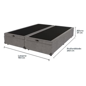 Marca: KazaMix Modelo: Baú Cor do Box: Cinza Tamanho: King Dimensões: 193X203X37 (Largura x Comprimento x Altura) Estrutura: Madeira Peso máximo recomendado: 150 kg (Por Pessoa) Altura do Box: 32 cm Altura dos Pés: 5 cm Altura total: 37 cm Garantia: 03 meses Selo Ecologicamente Correto