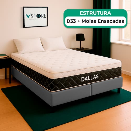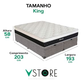 A tecnologia que a sua casa merece está na V-Store! O Conjunto Colchão Dallas e Base Box Baú Bravus combina conforto e praticidade. O colchão, com molas ensacadas, espuma D33, Euro Pillow e tecnologia EPS, oferece suporte ideal, conforto térmico, maior durabilidade e resistência. A base box baú, com estrutura reforçada e acabamento elegante, proporciona amplo espaço para armazenamento e organização do dormitório. Perfeito para quem busca qualidade, funcionalidade e sofisticação. Adquira agora e transforme suas noites de sono! Característica Do Colchão: Modelo: DallasMarca: V-StoreTamanho: KingDimensões: 193x20x203 (Largura x Altura x Comprimento)Conforto: MédioSistema: Molas EnsacadasPillow: Euro PillowPeso Máximo recomendado: 150 kg (Por pessoa)Proteções: Antiácaro, antialérgico, antifungo, antimofoGarantia: 12 Meses (Espuma) / 10 anos ( Conjunto de Molas Ensacadas)Característica Da Base: Marca: V-StoreModelo: BravusCor do Box: CinzaTamanho: KingDimensões: 193x44x203 (Largura x Altura x Comprimento)Estrutura: MadeiraPeso máximo recomendado: 150 kg (Por Pessoa)Altura do Box: 38 cmAltura dos Pés: 6 cmAltura total: 44 cmGarantia: 12 Meses (Estrutura) / 3 meses (Tecido)Selo Ecologicamente CorretoAtenção:- Antes de finalizar sua compra, recomendamos que verifique se as dimensões do produto são adequadas para serem transportadas pelos elevadores, portas, escadas e corredores de sua residência. Ressaltamos que não nos responsabilizamos pelo transporte do produto por meios específicos, como escadas, guinchos ou içamentos.- É possível que hajam leves variações de cor de acordo com o dispositivo que está sendo utilizado como smartphones, computadores, monitores e outros.