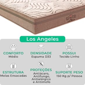 O Conjunto Colchão Los Angeles + Base Box Baú Bravus da V-Store oferece conforto e funcionalidade. O colchão, com molas ensacadas e sistema EPS, garante suporte ideal, conforto térmico e proteção . A base box, com amplo espaço de armazenamento, é feita de madeira reflorestada e revestida com tecido resistente, proporcionando praticidade e sofisticação ao seu quarto.