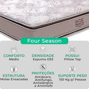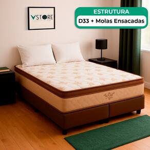 A tecnologia que a sua casa merece está na V-Store! O Conjunto Colchão Four Seasons e Base Box Baú Bravus é a solução ideal para quem busca conforto, durabilidade e praticidade. O colchão, com molas ensacadas, pillow top e tecnologia EPS, oferece suporte independente e conforto térmico, enquanto o revestimento em malha 100% algodão e tratamentos antiácaro e antialérgico garantem mais saúde e bem-estar. A Base Box Baú Bravus, feita com madeira reflorestada e revestida com tecido sintético, combina resistência, elegância e funcionalidade, oferecendo um excelente espaço de armazenamento e otimizando o seu quarto.Característica Do Colchão: Modelo: Four SeasonMarca: V-StoreTamanho: KingDimensões: 193x30x203 (Largura x Altura x Comprimento)Conforto: MédioSistema: Molas EnsacadasPillow: Pillow TopPeso Máximo recomendado: 150 kg (Por pessoa)Proteções: Antiácaro, antialérgico, antifungo, antimofoGarantia: 12 Meses (Espuma) / 10 anos ( Conjunto de Molas Ensacadas)Característica Da Base: Marca: V-StoreModelo: BravusCor do Box: MarromTamanho: KingDimensões: 193x44x203 (Largura x Altura x Comprimento)Estrutura: MadeiraPeso máximo recomendado: 150 kg (Por Pessoa)Altura do Box: 38 cmAltura dos Pés: 6 cmAltura total: 44 cmGarantia: 12 Meses (Estrutura) / 3 meses (Tecido)Selo Ecologicamente CorretoAtenção:- Antes de finalizar sua compra, recomendamos que verifique se as dimensões do produto são adequadas para serem transportadas pelos elevadores, portas, escadas e corredores de sua residência. Ressaltamos que não nos responsabilizamos pelo transporte do produto por meios específicos, como escadas, guinchos ou içamentos.- É possível que hajam leves variações de cor de acordo com o dispositivo que está sendo utilizado como smartphones, computadores, monitores e outros.