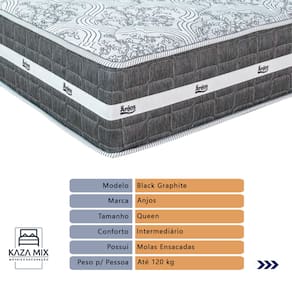 O conforto que sua casa precisa e a qualidade que você merece está na Kazamix!Experimente o conforto do colchão Black Graphite da Anjos. Com tecido em malha para maior respirabilidade e Molas Ensacadas que garantem suporte individualizado, ele proporciona uma noite de sono tranquila. Suas propriedades antiácaro e antialérgico oferecem um ambiente mais saudável, enquanto seu design moderno e 27 cm de altura oferecem o equilíbrio ideal entre conforto e sustentação.Invista em qualidade e durabilidade com o colchão Black Graphite.Modelo: Black Graphite 27Marca: AnjosTamanho: QueenDimensões: 158x198X27 (Largura x Comprimento x Altura)Conforto: IntermediárioSistema: Molas EnsacadasPillow: Não se AplicaPeso Máximo recomendado: 120 kg (Por pessoa)Proteções: Antiácaro, antialérgico, antifungo, antimofoGarantia: 1 ano pelo FabricanteO conforto que sua casa precisa e a qualidade que você merece está na KazamixAproveite cada metro quadrado do seu dormitório com a Cama Box Baú!Projetada com madeira de reflorestamento reforçada, a Cama Box Baú é a escolha ideal para quem busca otimização de espaço e praticidade na organização do dia a dia.Com um baú generoso, ela oferece a solução perfeita para armazenar travesseiros extras, cobertores, malas e muito mais. Além disso, sua estrutura robusta suporta até 150 kg por pessoa, garantindo a sustentação ideal para o seu colchão e prolongando sua vida útil.O pistão a gás robusto proporciona uma abertura suave e segura do baú, oferecendo praticidade e resistência no uso diário. Para completar, o acabamento de alta qualidade combina perfeitamente com qualquer estilo de decoração, agregando elegância e versatilidade ao seu ambiente.Não perca tempo! Adquira agora mesmo sua Cama Box Baú e diga adeus à falta de espaço e desorganização.Marca: KazaMixModelo: BaúCor do Box: MarromTamanho: QueenDimensões: 158X198X37 (Largura x Comprimento x Altura) Estrutura: MadeiraPeso máximo recomendado: 150 kg (Por Pessoa)Altura do Box: 32 cm Altura dos Pés: 5 cm Altura total: 37 cm Garantia: 03 mesesSelo Ecologicamente CorretoAtenção: Antes de finalizar sua compra, certifique-se de que as dimensões do produto sejam adequadas para serem transportadas pelos elevadores, portas, escadas e corredores de sua residência. Ressaltamos que não nos responsabilizamos pelo transporte do produto por meios específicos, como escadas, guinchos ou içamentos.