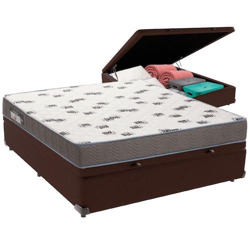 Com um baú generoso, ela oferece a solução perfeita para armazenar travesseiros extras, cobertores, malas e muito mais. Além disso, sua estrutura robusta suporta até 150 kg por pessoa, garantindo a sustentação ideal para o seu colchão e prolongando sua vida útil.
