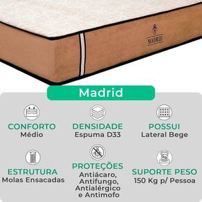 O Conjunto Colchão Madrid + Base Box Baú Bravus da V-Store oferece o equilíbrio perfeito entre conforto, praticidade e elegância. O colchão, com molas ensacadas e sistema EPS, garante noites de sono tranquilas, com suporte ideal e proteção contra ácaros e alergias. Já a base box baú, feita com madeira reflorestada, conta com um design sofisticado, amplo espaço de armazenamento e funcionalidade adicional para guardar travesseiros, malas e cobertores. Com capacidade para até 150 kg por pessoa, esse conjunto é ideal para quem busca qualidade e praticidade.
