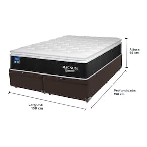 O conforto que sua casa precisa e a qualidade que você merece está na Kazamix!Descubra o colchão Magnum da Plumatex, a escolha ideal para quem busca conforto, suporte e qualidade. Com tecnologia avançada, o Magnum combina o melhor em materiais e design para proporcionar uma experiência de sono única.O colchão conta com uma camada de Malha Chronos 180 g/m², que oferece um toque macio e agradável. As Molas Ensacadas garantem suporte personalizado e distribuem o peso de forma uniforme, minimizando a transferência de movimento. A Espuma D26 oferece firmeza e conforto duradouro, enquanto o EPS Pillow Top Hig|h Tech adiciona um toque luxuoso, elevando ainda mais a experiência de descanso.Com proteção antiácaro, antialérgico e antifungo, o Magnum assegura um ambiente saudável para o seu sono. Ideal para quem deseja um colchão durável e de alta performance.Invista no seu bem-estar e experimente o conforto excepcional do Magnum.Modelo: MagnumMarca: PlumatexTamanho: QueenDimensões: 158x198X28 (Largura x Comprimento x Altura)Conforto: IntermediárioSistema: Molas EnsacadasPillow: Pillow TopPeso Máximo recomendado: 110 kg (Por pessoa)Proteções: Antiácaro, antialérgico, antifungo, antimofoGarantia: 1 ano pelo FabricanteO conforto que sua casa precisa e a qualidade que você merece está na KazamixAproveite cada metro quadrado do seu dormitório com a Cama Box Baú!Projetada com madeira de reflorestamento reforçada, a Cama Box Baú é a escolha ideal para quem busca otimização de espaço e praticidade na organização do dia a dia.Com um baú generoso, ela oferece a solução perfeita para armazenar travesseiros extras, cobertores, malas e muito mais. Além disso, sua estrutura robusta suporta até 150 kg por pessoa, garantindo a sustentação ideal para o seu colchão e prolongando sua vida útil.O pistão a gás robusto proporciona uma abertura suave e segura do baú, oferecendo praticidade e resistência no uso diário. Para completar, o acabamento de alta qualidade combina perfeitamente com qualquer estilo de decoração, agregando elegância e versatilidade ao seu ambiente.Não perca tempo! Adquira agora mesmo sua Cama Box Baú e diga adeus à falta de espaço e desorganização.Marca: KazaMixModelo: BaúCor do Box: MarromTamanho: QueenDimensões: 158X198X37 (Largura x Comprimento x Altura) Estrutura: MadeiraPeso máximo recomendado: 150 kg (Por Pessoa)Altura do Box: 32 cm Altura dos Pés: 5 cm Altura total: 37 cm Garantia: 03 mesesSelo Ecologicamente CorretoAtenção: Antes de finalizar sua compra, certifique-se de que as dimensões do produto sejam adequadas para serem transportadas pelos elevadores, portas, escadas e corredores de sua residência. Ressaltamos que não nos responsabilizamos pelo transporte do produto por meios específicos, como escadas, guinchos ou içamentos.