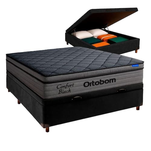 Cama Box Bau Preto+colchão Casal Confort Black Ortobom Conjunto Casal Colchão Confort Black + Cama Box Bau Preto O Colchão Confort Black Ortobom une tecnologia e conforto para um sono de qualidade. Conta com pillow top em espuma D28 selada, que garante maciez, resiliência e durabilidade. Sua estrutura interna em EPS de alta resistência oferece suporte firme e estável, mantendo a ergonomia ideal.