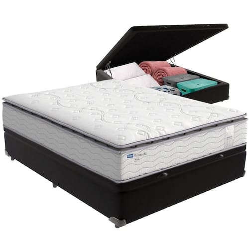 Com um baú generoso, ela oferece a solução perfeita para armazenar travesseiros extras, cobertores, malas e muito mais. Além disso, sua estrutura robusta suporta até 150 kg por pessoa, garantindo a sustentação ideal para o seu colchão e prolongando sua vida útil.