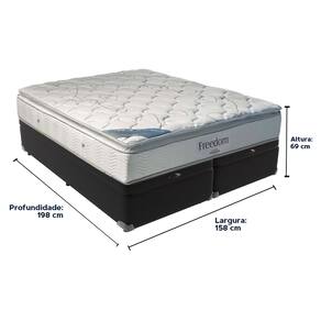 O conforto que sua casa precisa e a qualidade que você merece está na Kazamix!O Colchão Freedom Ortobom oferece o equilíbrio perfeito entre conforto e suporte. Com Molas Ensacadas, ele proporciona suporte individualizado, reduzindo a transferência de movimento, e sua camada de espuma viscoelástica D33 se adapta ao contorno do corpo, melhorando a circulação e proporcionando uma sensação única de aconchego.O Pillow Euro, com uma camada extra de espuma, traz ainda mais conforto e um toque de sofisticação, enquanto o sistema No Turn elimina a necessidade de virar o colchão, facilitando a manutenção.Ideal para quem busca um sono de qualidade e durabilidade, o Colchão Freedom é a escolha perfeita para casais ou quem deseja um colchão de altura imponente e design moderno. Produzido pela Ortobom, uma marca líder em tecnologia do sono, ele garante a qualidade e inovação que você merece. Invista no seu bem-estar e transforme suas noites com o Colchão Freedom Ortobom!Modelo: FreedomMarca: OrtobomTamanho: QueenDimensões: 158x198X32 (Largura x Comprimento x Altura)Conforto: MacioSistema: Molas EnsacadasPillow: Euro PillowPeso Máximo recomendado: 150 kg (Por pessoa)Proteções: Antiácaro, antialérgico, antifungo, antimofoGarantia: 1 ano pelo FabricanteO conforto que sua casa precisa e a qualidade que você merece está na KazamixAproveite cada metro quadrado do seu dormitório com a Cama Box Baú!Projetada com madeira de reflorestamento reforçada, a Cama Box Baú é a escolha ideal para quem busca otimização de espaço e praticidade na organização do dia a dia.Com um baú generoso, ela oferece a solução perfeita para armazenar travesseiros extras, cobertores, malas e muito mais. Além disso, sua estrutura robusta suporta até 150 kg por pessoa, garantindo a sustentação ideal para o seu colchão e prolongando sua vida útil.O pistão a gás robusto proporciona uma abertura suave e segura do baú, oferecendo praticidade e resistência no uso diário. Para completar, o acabamento de alta qualidade combina perfeitamente com qualquer estilo de decoração, agregando elegância e versatilidade ao seu ambiente.Não perca tempo! Adquira agora mesmo sua Cama Box Baú e diga adeus à falta de espaço e desorganização.Marca: KazaMixModelo: BaúCor do Box: PretoTamanho: QueenDimensões: 158X198X37 (Largura x Comprimento x Altura) Estrutura: MadeiraPeso máximo recomendado: 150 kg (Por Pessoa)Altura do Box: 32 cm Altura dos Pés: 5 cm Altura total: 37 cm Garantia: 03 mesesSelo Ecologicamente CorretoAtenção: Antes de finalizar sua compra, certifique-se de que as dimensões do produto sejam adequadas para serem transportadas pelos elevadores, portas, escadas e corredores de sua residência. Ressaltamos que não nos responsabilizamos pelo transporte do produto por meios específicos, como escadas, guinchos ou içamentos.