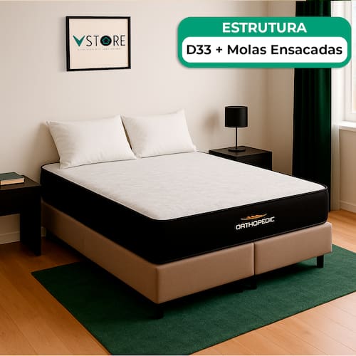 A tecnologia que a sua casa merece está na V-Store! O Conjunto Colchão Orthopedic + Base Box Baú Bravus da V-Store une conforto e funcionalidade. O colchão, com espuma D33 e suporte extra firme, oferece alinhamento ideal e proteção contra ácaros, alergias e fungos. A base box baú, com estrutura resistente e espaço interno, combina organização e estilo, otimizando seu dormitório com praticidade e elegância.Característica Do Colchão: Modelo: OrthopedicMarca: V-StoreTamanho: QueenDimensões: 158x30x198 (Largura x Altura x Comprimento)Conforto: Extra FirmeSistema: EspumaPillow: Não se aplicaPeso Máximo recomendado: 110 kg (Por pessoa)Proteções: Antiácaro, antialérgico, antifungo, antimofoGarantia: 12 Meses (Espuma)Característica Da Base: Marca: V-StoreModelo: BravusCor do Box: BegeTamanho: QueenDimensões: 158x44x198 (Largura x Altura x Comprimento)Estrutura: MadeiraPeso máximo recomendado: 150 kg (Por Pessoa)Altura do Box: 38 cmAltura dos Pés: 6 cmAltura total: 44 cmGarantia: 12 Meses (Estrutura) / 3 meses (Tecido)Selo Ecologicamente CorretoAtenção:- Antes de finalizar sua compra, recomendamos que verifique se as dimensões do produto são adequadas para serem transportadas pelos elevadores, portas, escadas e corredores de sua residência. Ressaltamos que não nos responsabilizamos pelo transporte do produto por meios específicos, como escadas, guinchos ou içamentos.- É possível que hajam leves variações de cor de acordo com o dispositivo que está sendo utilizado como smartphones, computadores, monitores e outros.