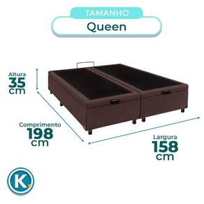 Modelo: Elite Marca: Nature Tamanho: Queen Tecido: Veludo Largura: 158cm Comprimento: 198cm Altura: 35cm Altura dos Pés: 7cm Material dos Pés: Madeira Suporte de Peso: 150Kg Peso: 40Kg Garantia: 3 Meses