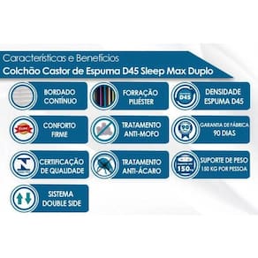 Abaixo segue os produtos do KIT: Conjunto Box Baú Queen: Colchão Espuma Castor D45 Sleep Max + Base CRC Courano White(158x198)