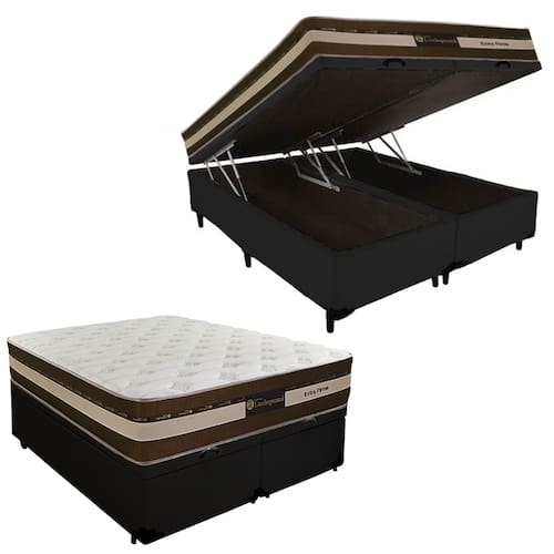Composição: Colchão: Molas Ensacadas Individuais + Espumas D45 e D28 Revestimento: Tecido Suede Premium Estrutura da base: Madeira de reflorestamento tratada Cor: Suede (pode variar conforme iluminação) Suporte de peso do colchão: até 150 kg por pessoa Suporte de peso da base baú: até 300 kg distribuídos