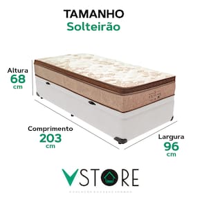 A tecnologia que a sua casa merece está na V-Store! O colchão Victory Solteiro da V-Store oferece noites de sono tranquilas e confortáveis, com seu toque macio e sistema de molas ensacadas que garantem suporte ideal e independência de movimentos. O Pillow Euro Pillow proporciona ainda mais suavidade, enquanto a tecnologia EPS adiciona resistência e durabilidade. Com proteções contra ácaros, fungos, mofo e alergias, ele garante um ambiente de sono saudável. Suporta até 150 kg por pessoa e tem garantia de 12 meses.A Base Box Baú Bravus da V-Store combina praticidade e sofisticação, com madeira reflorestada e revestimento sintético que facilitam a manutenção. Seu design otimiza o espaço de armazenamento e oferece resistência, suportando até 150 kg por pessoa. Com 44 cm de altura total e Selo Ecologicamente Correto, ela é ideal para quem busca sustentabilidade e qualidade. Transforme seu quarto com o colchão Victory e a Base Box Baú Bravus da V-Store!Característica Do Colchão: Modelo: VictoryMarca: V-StoreTamanho: SolteirãoDimensões: 96x30x203 (Largura x Altura x Comprimento)Conforto: MédioSistema: Molas EnsacadasPillow: Euro PillowPeso Máximo recomendado: 150 kg (Por pessoa)Proteções: Antiácaro, antialérgico, antifungo, antimofoGarantia: 12 Meses (Espuma) / 10 anos ( Conjunto de Molas Ensacadas)Característica Da Base: Marca: V-StoreModelo: BravusCor do Box: BrancoTamanho: SolteirãoDimensões: 96x44x203 (Largura x Altura x Comprimento)Estrutura: MadeiraPeso máximo recomendado: 150 kg (Por Pessoa)Altura do Box: 38 cmAltura dos Pés: 6 cmAltura total: 44 cmGarantia: 12 Meses (Estrutura) / 3 meses (Tecido)Selo Ecologicamente CorretoAtenção:- Antes de finalizar sua compra, recomendamos que verifique se as dimensões do produto são adequadas para serem transportadas pelos elevadores, portas, escadas e corredores de sua residência. Ressaltamos que não nos responsabilizamos pelo transporte do produto por meios específicos, como escadas, guinchos ou içamentos.- É possível que hajam leves variações de cor de acordo com o dispositivo que está sendo utilizado como smartphones, computadores, monitores e outros.