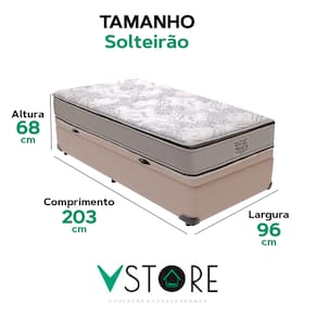 A tecnologia que a sua casa merece está na V-Store! O Conjunto Colchão Four Seasons e Base Box Baú Bravus é a solução ideal para quem busca conforto, durabilidade e praticidade. O colchão, com molas ensacadas, pillow top e tecnologia EPS, oferece suporte independente e conforto térmico, enquanto o revestimento em malha 100% algodão e tratamentos antiácaro e antialérgico garantem mais saúde e bem-estar. A Base Box Baú Bravus, feita com madeira reflorestada e revestida com tecido sintético, combina resistência, elegância e funcionalidade, oferecendo um excelente espaço de armazenamento e otimizando o seu quarto.Característica Do Colchão: Modelo: Four SeasonMarca: V-StoreTamanho: SolteirãoDimensões: 96x30x203 (Largura x Altura x Comprimento)Conforto: MédioSistema: Molas EnsacadasPillow: Pillow TopPeso Máximo recomendado: 150 kg (Por pessoa)Proteções: Antiácaro, antialérgico, antifungo, antimofoGarantia: 12 Meses (Espuma) / 10 anos ( Conjunto de Molas Ensacadas)Característica Da Base: Marca: V-StoreModelo: BravusTamanho: SolteirãoDimensões: 96x44x203 (Largura x Altura x Comprimento)Estrutura: MadeiraPeso máximo recomendado: 150 kg (Por Pessoa)Altura do Box: 38 cmAltura dos Pés: 6 cmAltura total: 44 cmGarantia: 12 Meses (Estrutura) / 3 meses (Tecido)Selo Ecologicamente CorretoAtenção:- Antes de finalizar sua compra, recomendamos que verifique se as dimensões do produto são adequadas para serem transportadas pelos elevadores, portas, escadas e corredores de sua residência. Ressaltamos que não nos responsabilizamos pelo transporte do produto por meios específicos, como escadas, guinchos ou içamentos.- É possível que hajam leves variações de cor de acordo com o dispositivo que está sendo utilizado como smartphones, computadores, monitores e outros.