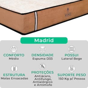 O Conjunto Colchão Madrid + Base Box Baú Bravus da V-Store oferece o equilíbrio perfeito entre conforto, praticidade e elegância. O colchão, com molas ensacadas e sistema EPS, garante noites de sono tranquilas, com suporte ideal e proteção contra ácaros e alergias. Já a base box baú, feita com madeira reflorestada, conta com um design sofisticado, amplo espaço de armazenamento e funcionalidade adicional para guardar travesseiros, malas e cobertores. Com capacidade para até 150 kg por pessoa, esse conjunto é ideal para quem busca qualidade e praticidade.