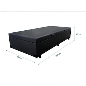 Cama Baú Solteiro 88 - Bello Tecido Sintético Preto Por que a Base com Baú? Quer dormir tranquilamente e deixar o seu quarto com um visual impecável? Para isso você pode contar com a Base com Baú ! Linda, ela é fabricada com materiais de ótima qualidade e excelente resistência! O móvel ainda conta com um baú, ideal para guardar as roupas de cama como edredom e cobertores. Curtiu, né? A peça é perfeita para acomodar o seu colchão para que você desfrute de uma deliciosa noite de sono! ;O Baú com Pistão tem um sistema de fácil abertura por pistões a Gás (amortecedores). ;Especificações Técnicas da Cama Baú:- Material: Madeira tratada;- Proteções: Antiácaro, Antialérgico, Antifungo, Antimofo;- Peso máximo recomendado: até 100kg (por pessoa);- Altura do baú: 40cm (35cm com 6cm dos pés);- Revestimento: Tecido Sintético;- Cor: Preto.- Quantidade de Pés: 6 pés;- Material dos pés: Plástico;- : 3 meses;- Tamanho: Solteiro;- Dimensões do produto (altura x largura x comprimento): 40x88x188cm*ATENÇÃO: ;- Verifique se as dimensões dos produtos passam por elevadores, portas, escadas e corredores. ;- Não nos responsabilizamos pelo dos produtos por escadas, guinchos, içamentos ou quaisquer outros meios específicos de .- As imagens ambientadas são meramente ilustrativas e podem apresentar itens que não compõe o produto.- As cores do produto podem variar de acordo com o monitor, a iluminação do ambiente ou sua percepção visual. ;