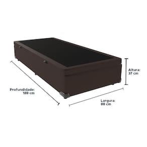 Marca: KazaMix Modelo: Baú Cor do Box: Marrom Tamanho: Solteiro Dimensões: 88X188X37 (Largura x Comprimento x Altura) Estrutura: Madeira Peso máximo recomendado: 150 kg (Por Pessoa) Altura do Box: 32 cm Altura dos Pés: 5 cm Altura total: 37 cm Garantia: 03 meses Selo Ecologicamente Correto