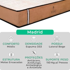 A tecnologia que a sua casa merece está na V-Store! O Conjunto Colchão Madrid + Base Box Baú Bravus da V-Store oferece o equilíbrio perfeito entre conforto, praticidade e elegância. O colchão, com molas ensacadas e sistema EPS, garante noites de sono tranquilas, com suporte ideal e proteção contra ácaros e alergias. Já a base box baú, feita com madeira reflorestada, conta com um design sofisticado, amplo espaço de armazenamento e funcionalidade adicional para guardar travesseiros, malas e cobertores. Com capacidade para até 150 kg por pessoa, esse conjunto é ideal para quem busca qualidade e praticidade.Característica Do Colchão: Modelo: MadridMarca: V-StoreTamanho: SolteiroDimensões: 88x28x188 (Largura x Altura x Comprimento)Conforto: MédioSistema: Molas EnsacadasPillow: Não se aplicaPeso Máximo recomendado: 150 kg (Por pessoa)Proteções: Antiácaro, antialérgico, antifungo, antimofoGarantia: 12 Meses (Espuma) / 10 anos ( Conjunto de Molas Ensacadas)Característica Da Base: Marca: V-StoreModelo: BravusCor do Box: BrancoTamanho: SolteiroDimensões: 88x44x188 (Largura x Altura x Comprimento)Estrutura: MadeiraPeso máximo recomendado: 150 kg (Por Pessoa)Altura do Box: 38 cmAltura dos Pés: 6 cmAltura total: 44 cmGarantia: 12 Meses (Estrutura) / 3 meses (Tecido)Selo Ecologicamente CorretoAtenção:- Antes de finalizar sua compra, recomendamos que verifique se as dimensões do produto são adequadas para serem transportadas pelos elevadores, portas, escadas e corredores de sua residência. Ressaltamos que não nos responsabilizamos pelo transporte do produto por meios específicos, como escadas, guinchos ou içamentos.- É possível que hajam leves variações de cor de acordo com o dispositivo que está sendo utilizado como smartphones, computadores, monitores e outros.