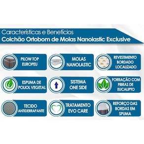 Dimensões(Cm): Comprimento(Profundidade): 188cm x Largura: 88cm x Altura: 30cm Vantagens Extras de Colchão - Ecologicamente Correto - c/ Sistema Polyframe - Sob Medida Tipo de Pillow - Pillow Top Europeu Tecido com Tratamento - AntiÁcaro e AntiFungo - Evo Care Tipo de Bordado do Tecido de Revestimento - Localizado Tipo Tecido de Forração Revestimento - Fibras de Eucalipto Tipo de Forração do Revestimento Inferior - Antiderrapante Tipo de Tecido de Revestimento da Faixa Lateral - Poliéster Modo de Utilização - One Side Camadas Interna do Estofamento de Espuma - D26 - D33 Tipo de Espuma - Espuma de Poliol Vegetal Tipo de Mola - Nanolastic Nível de Firmeza do Colchão - Macio c/ Firmeza Peso Máximo Suportado - 150 kg Certificação de Qualidade - Qualidade Aprovada Nossa Avaliação - Qualidade Excelente Tempo de Garantia - Certificado de Garantia Digital - 60 meses