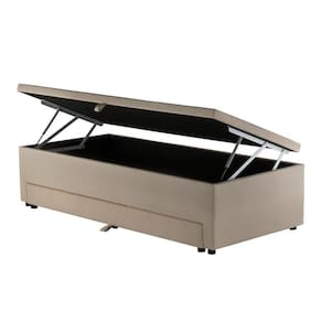 Modelo de colchão: Solteiro Para colchão de: 88 x 188 cm Matéria-prima: Madeira de Eucalipto e MDF Revestimento:: Espuma 100 poliuretano revestida com tecido 100 poliéster Tampo: Tecido Antiderrapante Levantamento do tampo: Suspenção Pneumática Cama auxiliar: Espuma D26 Respiros laterais: Sim Peso Suportado: Até 120 kg Pés: Plásticos Altura dos pés: 7 cm Sistema de montagem: É necessário fixar os pés e os pistões