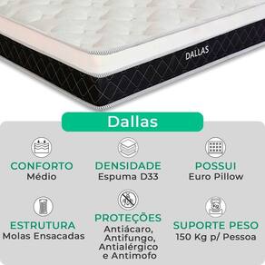 O Conjunto Colchão Dallas e Base Box Baú Bravus combina conforto e praticidade. O colchão, com molas ensacadas, espuma D33, Euro Pillow e tecnologia EPS, oferece suporte ideal, conforto térmico, maior durabilidade e resistência. A base box baú, com estrutura reforçada e acabamento elegante, proporciona amplo espaço para armazenamento e organização do dormitório. Perfeito para quem busca qualidade, funcionalidade e sofisticação.