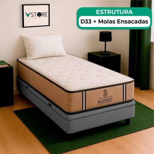 A tecnologia que a sua casa merece está na V-Store! O Conjunto Colchão Madrid + Base Box Baú Bravus da V-Store oferece o equilíbrio perfeito entre conforto, praticidade e elegância. O colchão, com molas ensacadas e sistema EPS, garante noites de sono tranquilas, com suporte ideal e proteção contra ácaros e alergias. Já a base box baú, feita com madeira reflorestada, conta com um design sofisticado, amplo espaço de armazenamento e funcionalidade adicional para guardar travesseiros, malas e cobertores. Com capacidade para até 150 kg por pessoa, esse conjunto é ideal para quem busca qualidade e praticidade.Característica Do Colchão: Modelo: MadridMarca: V-StoreTamanho: SolteiroDimensões: 88x28x188 (Largura x Altura x Comprimento)Conforto: MédioSistema: Molas EnsacadasPillow: Não se aplicaPeso Máximo recomendado: 150 kg (Por pessoa)Proteções: Antiácaro, antialérgico, antifungo, antimofoGarantia: 12 Meses (Espuma) / 10 anos ( Conjunto de Molas Ensacadas)Característica Da Base: Marca: V-StoreModelo: BravusTamanho: SolteiroDimensões: 88x44x188 (Largura x Altura x Comprimento)Estrutura: MadeiraPeso máximo recomendado: 150 kg (Por Pessoa)Altura do Box: 38 cmAltura dos Pés: 6 cmAltura total: 44 cmGarantia: 12 Meses (Estrutura) / 3 meses (Tecido)Selo Ecologicamente CorretoAtenção:- Antes de finalizar sua compra, recomendamos que verifique se as dimensões do produto são adequadas para serem transportadas pelos elevadores, portas, escadas e corredores de sua residência. Ressaltamos que não nos responsabilizamos pelo transporte do produto por meios específicos, como escadas, guinchos ou içamentos.- É possível que hajam leves variações de cor de acordo com o dispositivo que está sendo utilizado como smartphones, computadores, monitores e outros.