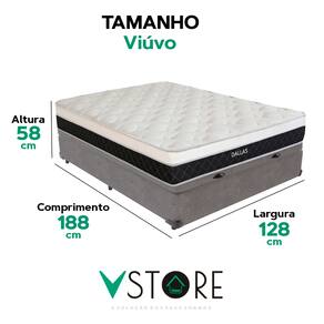 A tecnologia que a sua casa merece está na V-Store! O Conjunto Colchão Dallas e Base Box Baú Bravus combina conforto e praticidade. O colchão, com molas ensacadas, espuma D33, Euro Pillow e tecnologia EPS, oferece suporte ideal, conforto térmico, maior durabilidade e resistência. A base box baú, com estrutura reforçada e acabamento elegante, proporciona amplo espaço para armazenamento e organização do dormitório. Perfeito para quem busca qualidade, funcionalidade e sofisticação. Adquira agora e transforme suas noites de sono! Característica Do Colchão: Modelo: DallasMarca: V-StoreTamanho: ViuvoDimensões: 128x20x188 (Largura x Altura x Comprimento)Conforto: MédioSistema: Molas EnsacadasPillow: Euro PillowPeso Máximo recomendado: 150 kg (Por pessoa)Proteções: Antiácaro, antialérgico, antifungo, antimofoGarantia: 12 Meses (Espuma) / 10 anos ( Conjunto de Molas Ensacadas)Característica Da Base: Marca: V-StoreModelo: BravusCor do Box: CinzaTamanho: ViúvoDimensões: 128x44x188 (Largura x Altura x Comprimento)Estrutura: MadeiraPeso máximo recomendado: 150 kg (Por Pessoa)Altura do Box: 38 cmAltura dos Pés: 6 cmAltura total: 44 cmGarantia: 12 Meses (Estrutura) / 3 meses (Tecido)Selo Ecologicamente CorretoAtenção:- Antes de finalizar sua compra, recomendamos que verifique se as dimensões do produto são adequadas para serem transportadas pelos elevadores, portas, escadas e corredores de sua residência. Ressaltamos que não nos responsabilizamos pelo transporte do produto por meios específicos, como escadas, guinchos ou içamentos.- É possível que hajam leves variações de cor de acordo com o dispositivo que está sendo utilizado como smartphones, computadores, monitores e outros.