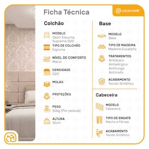 Sejam bem-vindos(as) a Lucas Home! Um conjunto primordial para seu quarto e um lugar de descanso pleno. A cabeceira Cassis é produzida com madeira de eucalipto e espuma D12. Possui um acabamento de alta qualidade deixando o seu ambiente mais sofisticado e despojado, dando aquele conforto na hora de ver filmes, séries e ler uma revista ou um bom livro. A base box é confeccionada com madeira de reflorestamento, tratamentos anticupim e antimofo. Seu revestimento de alta qualidade agrega valor e sofisticação ao quarto. O Colchão Supreme D20 é produzido em espuma D20 possuindo tecnologia Double face (você pode girar e virar, com isso a parte utilizada passa a descansar no período que não é utilizada). Suportando até 50kg (por pessoa) proporcionando conforto firme, o que lhe confere firmeza suficiente para preservar sua coluna durante o sono sem comprometer seu conforto.