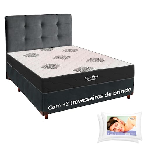 Colchão: Molas Ensacadas, Tecido Malha 180gr. Cama Box: Veludo, Madeira (pés). Cabeceira: Veludo. Travesseiros: Flocos de espuma, Fibra Siliconada.Vendido e entregue por Kasamix Móveis