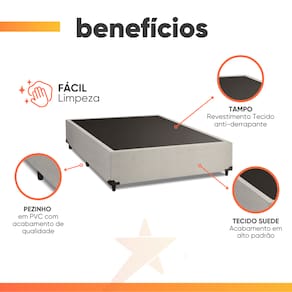 O Box é a escolha ideal para quem busca praticidade, beleza e modernidade em um só produto. Revestido com tecido em linho apresenta uma estrutura resistente fabricado com materias de qualidade, ele une estilo e funcionalidade. Sua estrutura é fabricada com madeira de eucalipto e pinus, materiais reconhecidos pela resistência e durabilidade. Além de garantir um visual mais elegante ao ambiente, o Box otimiza o espaço do seu quarto, tornando-o mais organizado e aconchegante. Fácil de limpar e acompanha um jogo de pés em PVC, é a combinação perfeita entre praticidade e bom gosto.