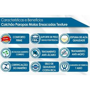 Dimensões(Cm): Comprimento(Profundidade): 188cm x Largura: 138cm x Altura: 30cm Vantagens Extras de Colchão - Ecologicamente Correto - c/ Sistema Polyframe - Manta Acrílica - EPS Tipo de Pillow - Pillow Top Europeu Tecido com Tratamento - AntiÁcaro e AntiFungo Tipo de Bordado do Tecido de Revestimento - Contínuo Tipo Tecido de Forração Revestimento - Jacquard Tipo de Forração do Revestimento Inferior - Antiderrapante Tipo de Tecido de Revestimento da Faixa Lateral - Decorativa Modo de Utilização - One Side Camadas Interna do Estofamento de Espuma - Alta Qualidade - AG Tipo de Mola - Ensacadas MasterPocket Nível de Firmeza do Colchão - Firme Peso Máximo Suportado - 150 kg Certificação de Qualidade - Qualidade Aprovada - INMETRO - Qualidade Costa Rica Nossa Avaliação - Qualidade Muito Boa Tempo de Garantia - 12 meses