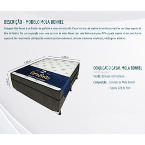 Se você procura uma cama com alta qualidade em seus materiais e ideal para suas noites de sono, essa é pra você! Conjugado Mola Bonnel é um Produto de qualidade e maior altura do chão. Possui estrutura de Madeira de Eucalipto extra firme com chapa superior de fibra de Madeira. Em sua composição temos uma estrutura em molas Bonnel com uma lâmina de espuma D28 na parte superior do box com 5cm de espessura. Seu revestimento utiliza tecido matelassê com fino acabamento, contendo tratamento antialérgico, antifungo e antiácaro.