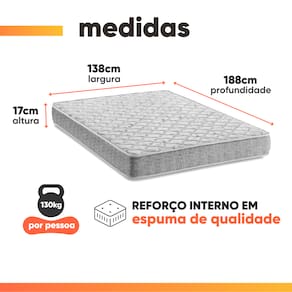 MEDIDAS: [ A ] = 55 cm / 43 cm (sem os pés) [ L ] = 138 cm [ P ] = 188 cm PESO SUPORTADO: 100 kg por pessoa PESO: 42kg ALTURA DOS PÉS: 12 cm MODELO: Cama Box Casal Espuma D33 Inducol Soft 138x188x55cm MARCA DO COLCHÃO: CBP MARCA DO BOX: Prince REVESTIMENTO SUPERIOR E LATERAL: Tecido matelado em poliéster, que une maciez, resistência e acabamento sofisticado REVESTIMENTO INTERNO: Espuma de alta qualidade D33 dentro dos padrões ABNT que garante firmeza, durabilidade e o suporte ideal para uma noite de sono mais confortável REVESTIMENTO INFERIOR: Tecido matelado poliéster ESPUMA: D33 de alta performance TECIDO DO BOX: Suede elegante e resistente ESTRUTURA: Madeira de Eucalipto e Pinus, proporcionando maior estabilidade e durabilidade PÉS: 6 unidades MATERIAL DOS PÉS: Plástico resistente DIFERENCIAIS DO COLCHÃO: Espuma D33 de alta qualidade, que garante maior firmeza e suporte ao corpo. Revestimento matelado em poliéster, que proporciona maciez e um acabamento sofisticado. Estrutura desenvolvida para maior durabilidade e conforto ITENS INCLUSOS: 1 Colchão Casal (138cm), 1 Box Casal (138cm) INSTRUÇÕES E CUIDADOS: Utilizar em local seco e arejado, não dobrar, fazer giro quinzenalmente no sentido pés/cabeceira GARANTIA DO BOX: 3 meses pelo fabricante GARANTIA DO COLCHÃO: 12 meses pelo fabricante