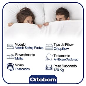 O Colchão Casal Ortobom Airtech Molas Ensacadas oferece uma experiência de sono excepcionalmente confortável e suporte personalizado para noites de descanso revitalizante. Contando com molas ensacadas e espuma, ele é a opção perfeita para acomodar bem seu corpo e deixar você bem aconchegado, levando maior bem-estar às suas horas de descanso.